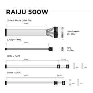 Il Raijin ATX‑500B integra connettori SATA, Molex e PCIe 6-pin, offrendo la compatibilita necessaria per alimentare i componenti fondamentali del tuo sistema. Un setup semplice e funzionale, perfetto per chi cerca efficienza e versatilita in un unico prodotto.