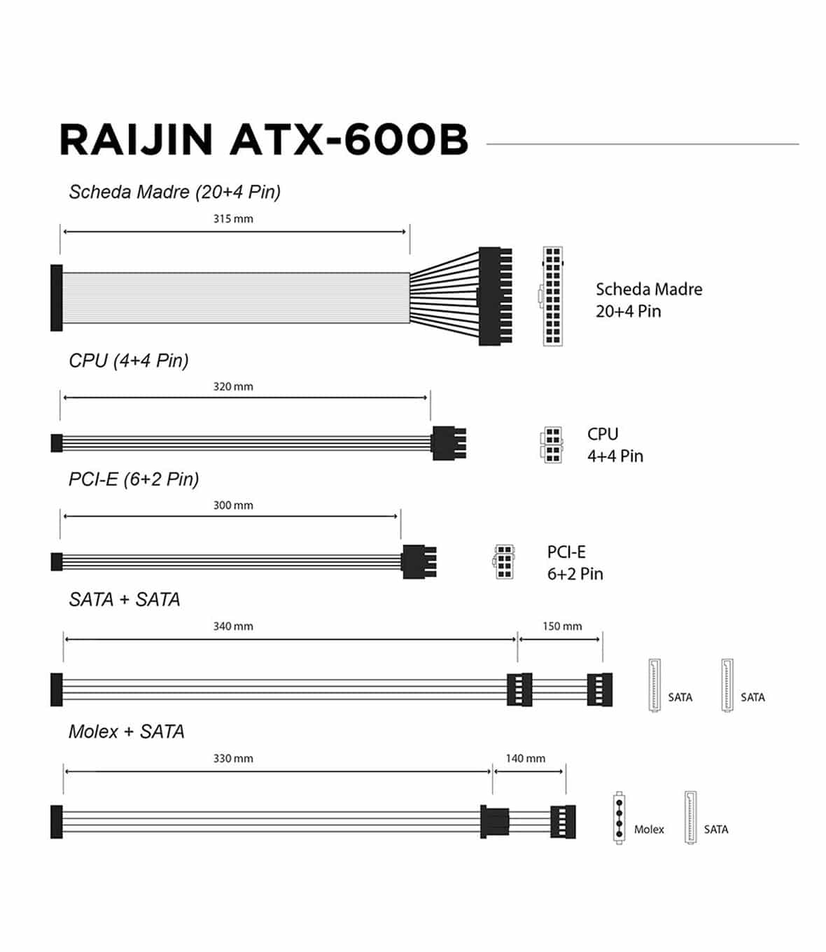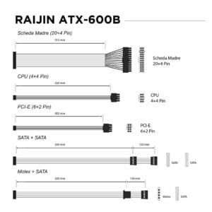 Il Raijin ATX‑600B integra vari connettori offrendo la compatibilita necessaria per alimentare i componenti fondamentali del tuo sistema. Un setup semplice e funzionale, perfetto per chi cerca efficienza e versatilita in un unico prodotto.